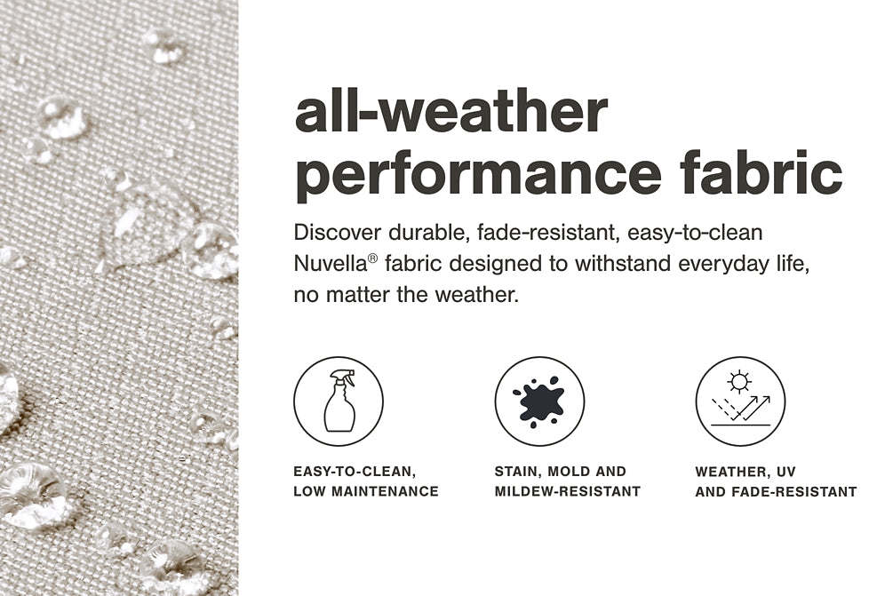 Details | All-weather resin wicker handwoven over powder coated rust-resistant aluminum frame, Cushion covered in high-performing Nuvella® fabric, All-weather foam cushion core wrapped in soft polyester, Clean fabric with mild soap and water, let air dry; for stubborn stains, use a solution of 4 oz. bleach to 28 oz. water, Imported fabric and fill | |