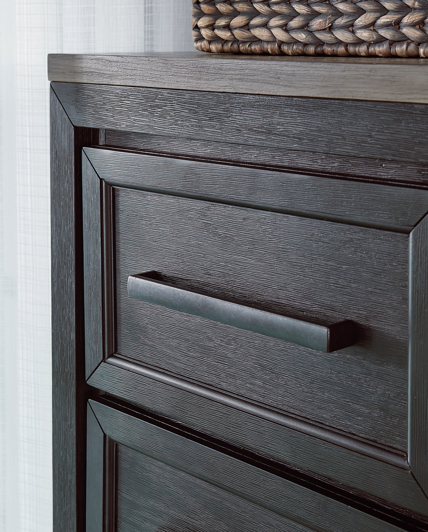 Details | B989B5: Includes California king panel headboard, storage footboard, and rails with roll slats, Made with hardwood solids, select oak veneers and engineered wood, Two-tone finish (brushed black and dusty grayish brown wood tone), Headboard with picture frame moulding, Footboard with two deep drawers, Smooth-gliding soft-close drawers with fully finished interiors and dovetail construction, Sleek drawer pulls with black finish, Bed does not require additional foundation/box spring; accommodates most zero clearance adjustable bases with the addition of a bunkie board, Mattress available, sold separately, Assembly required, B989B1: Includes dresser and mirror, Made with hardwood solids, select oak veneers and engineered wood, Two-tone finish (brushed black and dusty grayish brown wood tone), Sleek drawer pulls with black finish, 11 soft-close, smooth-gliding drawers with fully finished interiors and dovetail construction (top drawers felt lined), 5 drawers with brushed black finish; 6 drawers with grayish brown wood tone, 3 drawers located behind each door, Mirror mounts to back of dresser, Assembly required, | |