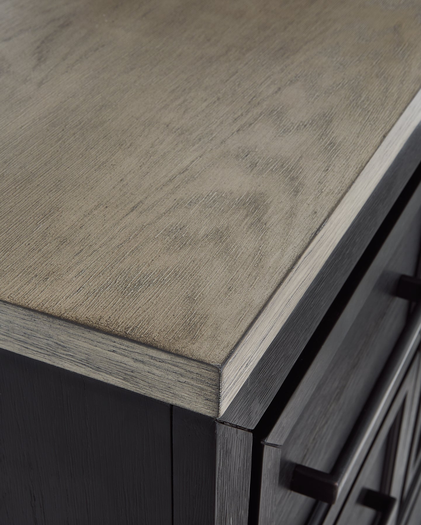 Details B989B5: Includes California king panel headboard, storage footboard, and rails with roll slats, Made with hardwood solids, select oak veneers and engineered wood, Two-tone finish (brushed black and dusty grayish brown wood tone), Headboard with picture frame moulding, Footboard with two deep drawers, Smooth-gliding soft-close drawers with fully finished interiors and dovetail construction, Sleek drawer pulls with black finish, Bed does not require additional foundation/box spring; accommodates most zero clearance adjustable bases with the addition of a bunkie board, Mattress available, sold separately, Assembly required, B989B1: Includes dresser and mirror, Made with hardwood solids, select oak veneers and engineered wood, Two-tone finish (brushed black and dusty grayish brown wood tone), Sleek drawer pulls with black finish, 11 soft-close, smooth-gliding drawers with fully finished interiors and dovetail construction (top drawers felt lined), 5 drawers with brushed black finish; 6 drawers with grayish brown wood tone, 3 drawers located behind each door, Mirror mounts to back of dresser, Assembly required, B989-48: Made with hardwood solids, select oak veneers and engineered wood, Two-tone finish (brushed black and dusty grayish brown wood tone), Sleek drawer pulls with black finish, 5 soft-close, smooth-gliding drawers with fully finished interiors and dovetail construction (top drawers felt lined), 3 pull-out trays (felt lined) and 2 adjustable shelves behind door,