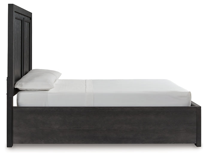 Details Includes queen panel headboard, storage footboard, and rails with roll slats, Made with hardwood solids, select oak veneers and engineered wood, Two-tone finish (brushed black and dusty grayish brown wood tone), Headboard with picture frame moulding, Footboard with two deep drawers, Smooth-gliding soft-close drawers with fully finished interiors and dovetail construction, Sleek drawer pulls with black finish, Bed does not require additional foundation/box spring; accommodates most zero clearance adjustable bases with the addition of a bunkie board, Mattress available, sold separately, Assembly required