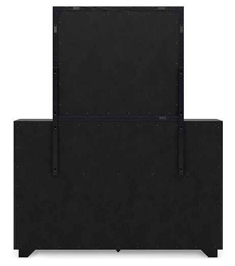 Details | B768B2: Includes headboard, footboard and rails, Made with pine solids, veneers and engineered wood substrate, Textured black wood stain with waxy topcoat, Extra wide rails for a bench-like wrap around, Foundation/box spring required, sold separately, Mattress available, sold separately, Assembly required, B768B1: Includes dresser and mirror, Made with pine solids, veneers and engineered wood substrate, Textured black wood stain with waxy topcoat, Hardware-less design, 6 drawers with fully finished interiors, dovetail construction and ball-bearing side glides (top drawers felt lined), Mirror attaches to back of dresser, | |